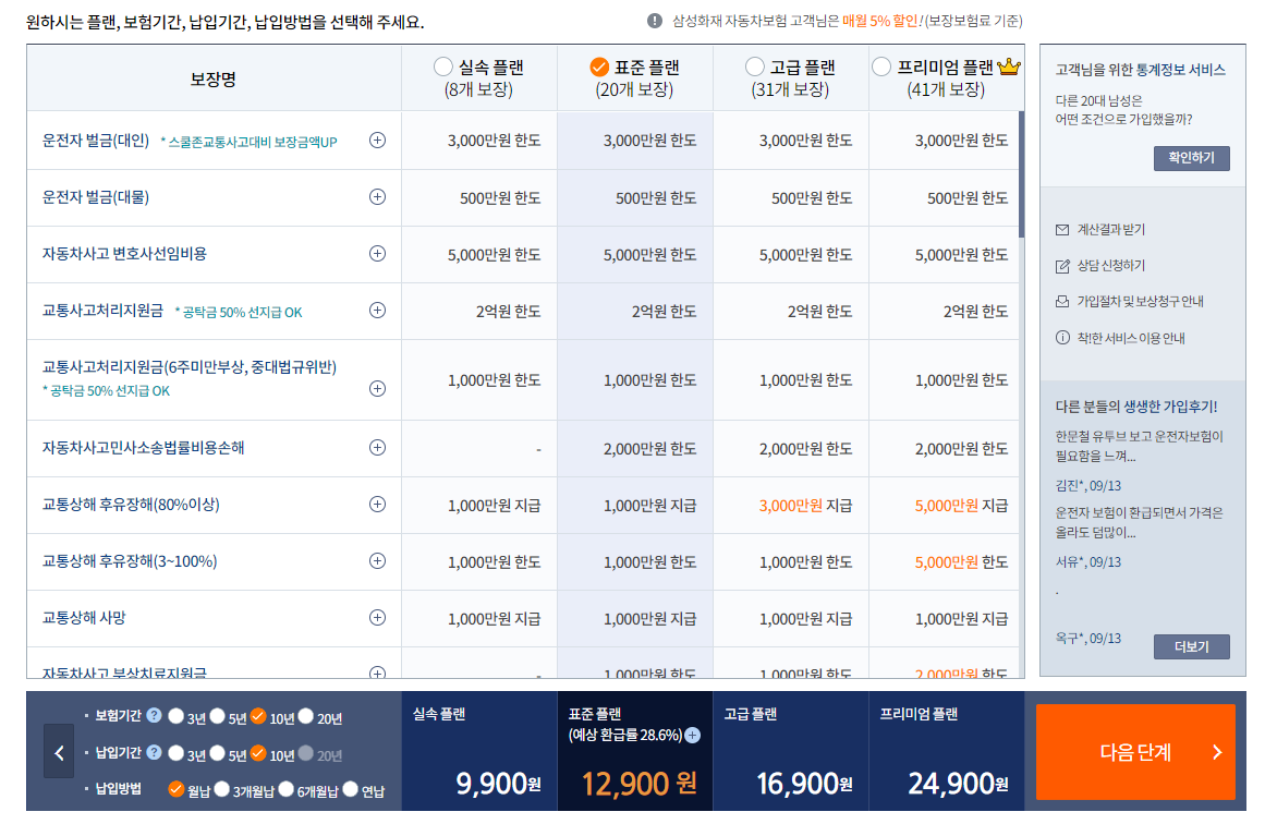 다만, 가입기준이 40세 남성을 기준으로 하는 것이기 때문에 실제 가입조건과는 조금 다를 수 있습니다. 또한, 앞서 말씀드린데로 표시되는 가격은 실속형 보험의 가격입니다.